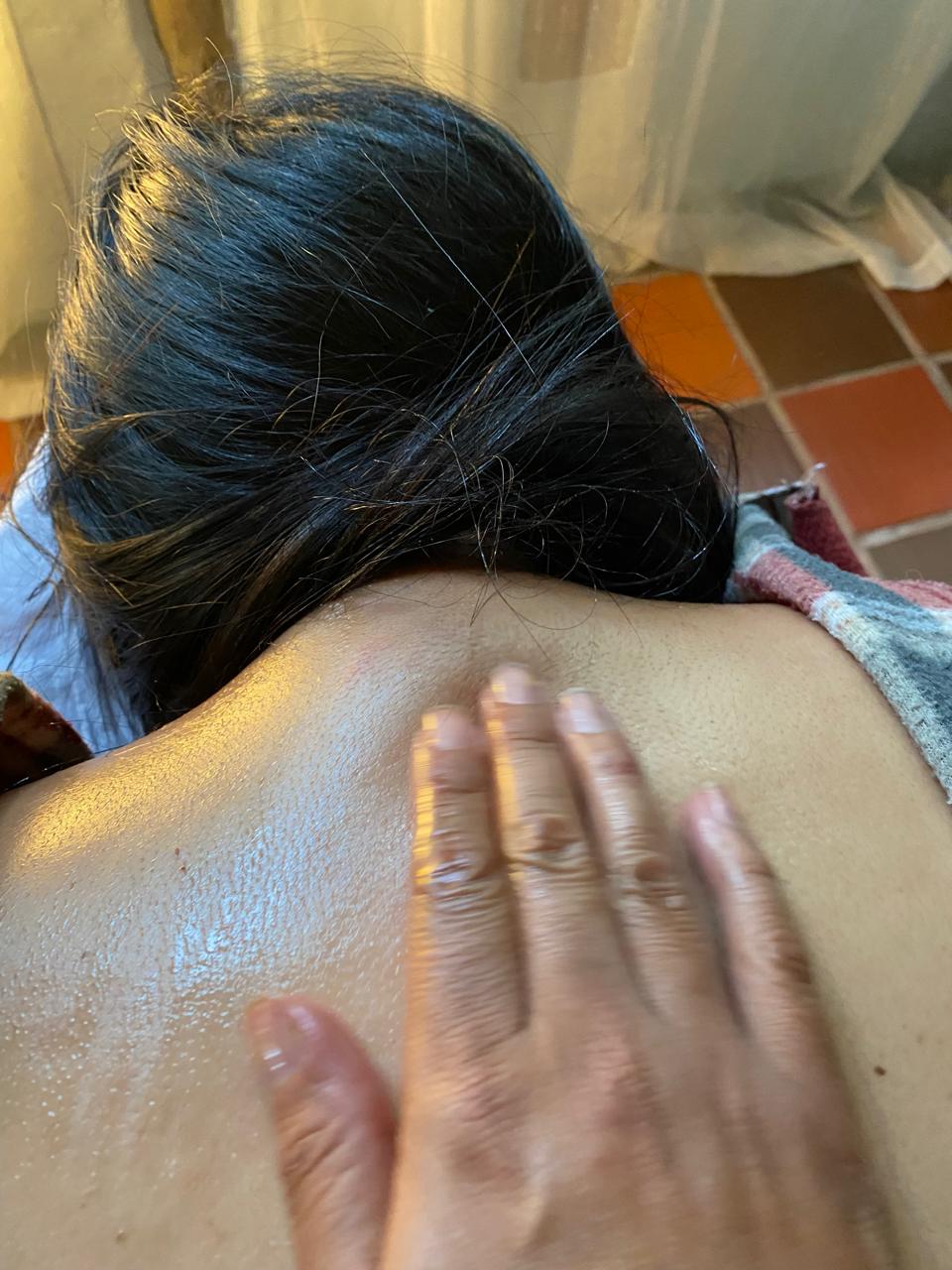 Masaje de cuerpo completo, de pies a cabeza, bañado en una mezcla de aceite de coco y ajonjolí tibios con aceites esenciales relajantes. Integra maniobras de masaje Thai y Tuina (masaje chino), estiramientos suaves y recorrido por canales de acupuntura y líneas energéticas para liberar tensión física y emocional, equilibrar el sistema nervioso y mejorar el sueño.